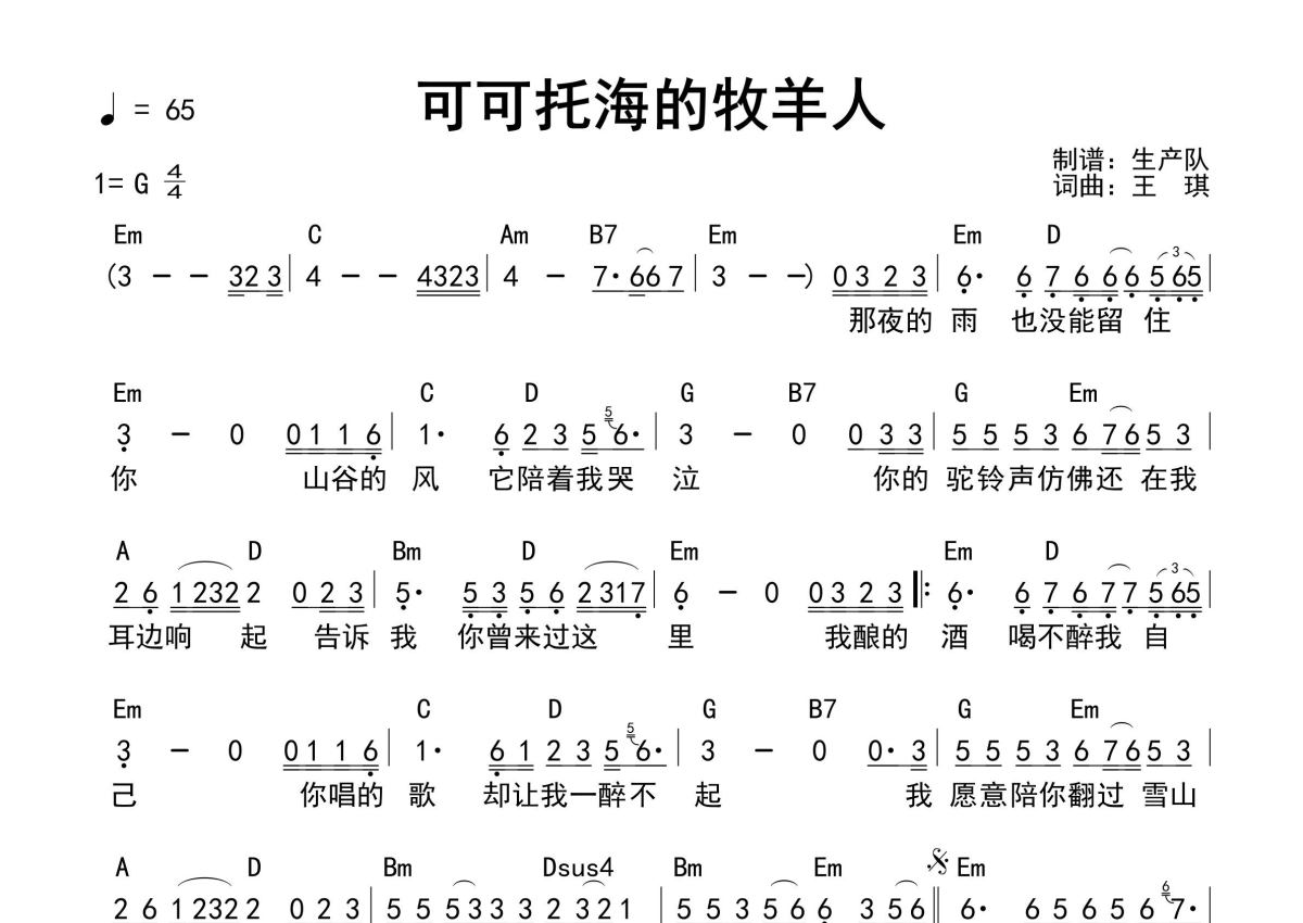 《可可托海的牧羊人(和弦谱)》是和弦谱演唱的一首歌曲,和弦弹唱谱,拍号为4/4拍,歌曲速度为每分钟65拍,这份简谱共有一张高清图谱,图谱由 @生产队 编配上传王琪演唱的经典歌曲《可可托海的牧羊人》和弦弹唱谱,免翻页编配。