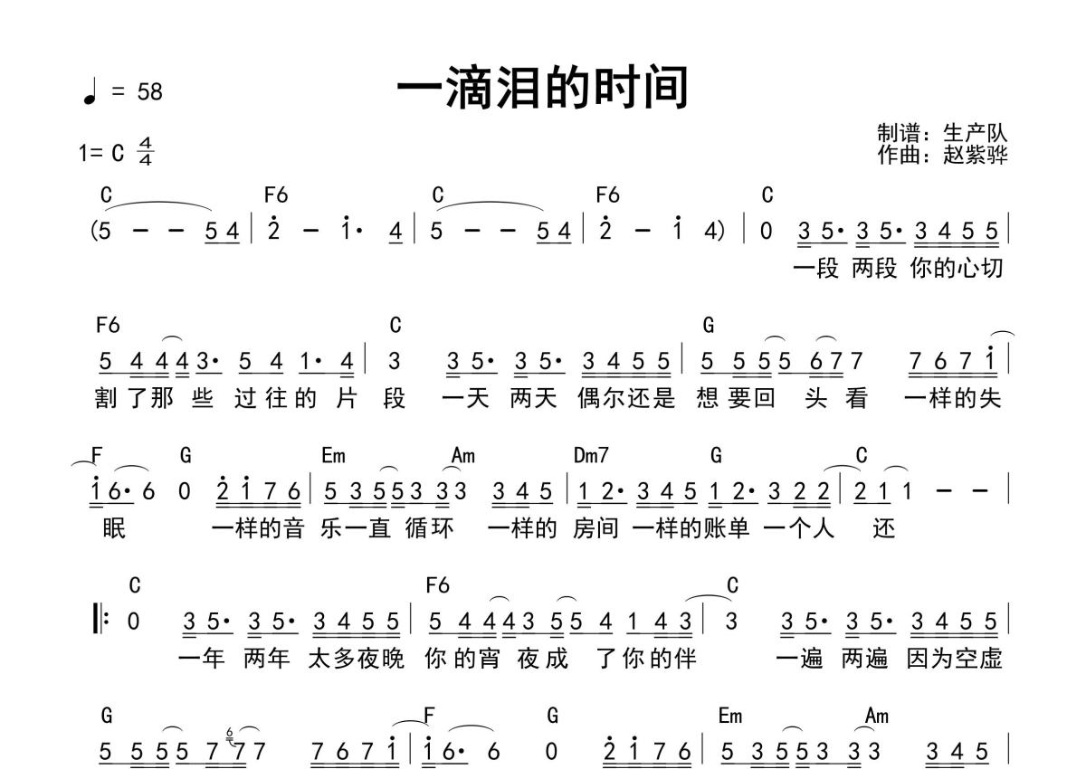《一滴泪的时间(和弦谱)》是和弦谱演唱的一首歌曲,和弦弹唱谱,拍号为4/4拍,歌曲速度为每分钟58拍,这份简谱共有一张高清图谱,图谱由 @生产队 编配上传赵紫骅演唱的经典歌曲《一滴泪的时间》和弦弹唱谱,免翻页编配。