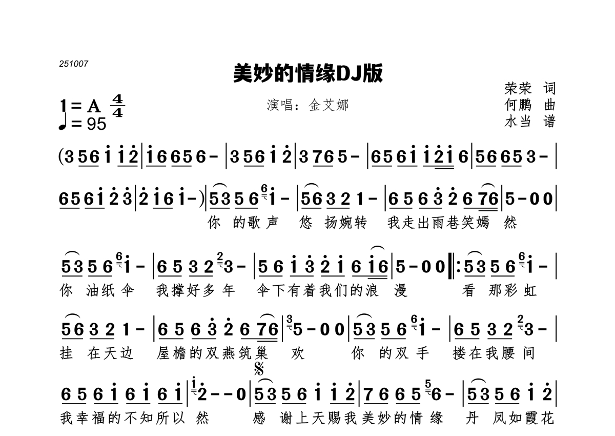 《美妙的情缘DJ版》是金艾娜演唱的一首歌曲,拍号为4/4拍,歌曲速度为每分钟95拍,这份简谱共有一张高清图谱,图谱由 @水当 编配上传。