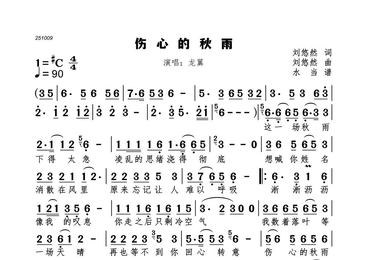 伤心的秋雨简谱 - 龙翼演唱