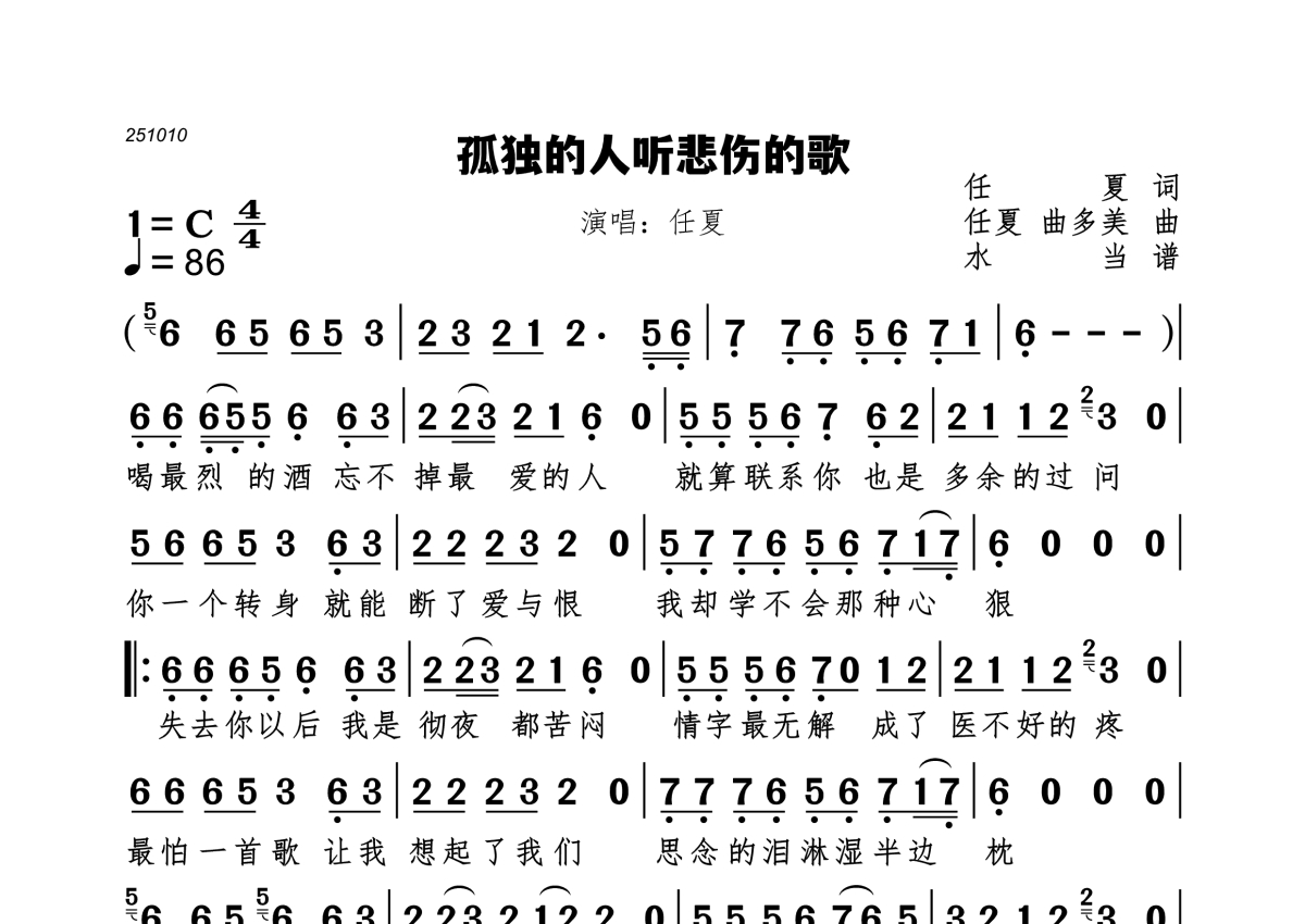 孤独的人听悲伤的歌简谱 - 任夏演唱