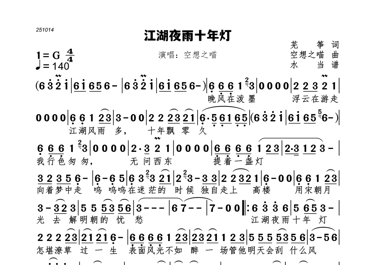 《江湖夜雨十年灯》是空想之猫演唱的一首歌曲,拍号为4/4拍,歌曲速度为每分钟140拍,这份简谱共有一张高清图谱,图谱由 @水当 编配上传。