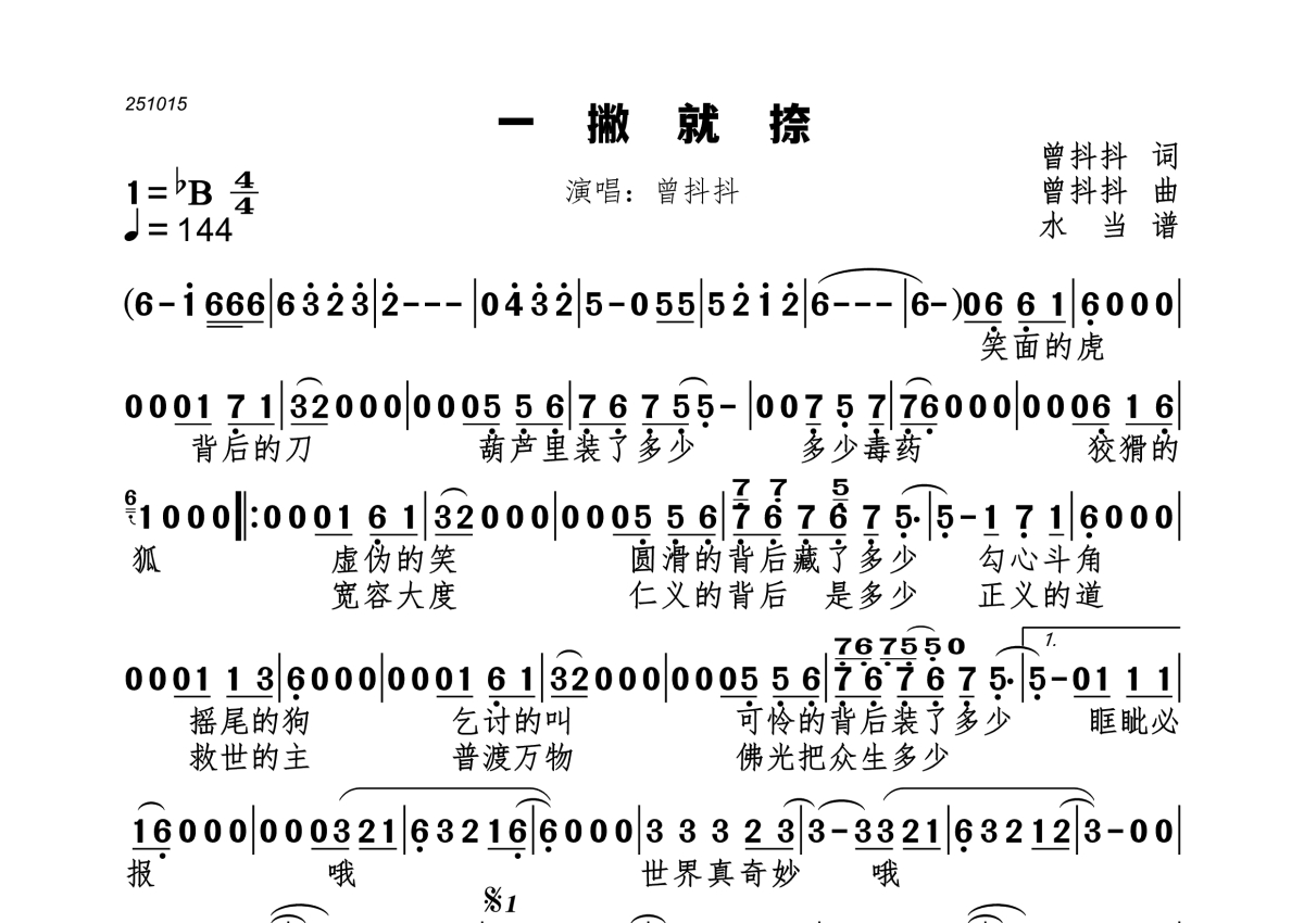 《一撇就捺》是曾抖抖演唱的一首歌曲,拍号为4/4拍,歌曲速度为每分钟144拍,这份简谱共有一张高清图谱,图谱由 @水当 编配上传。