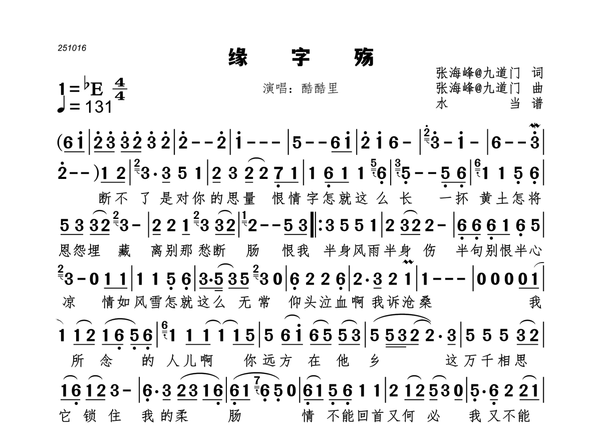 《缘字殇》是酷酷里演唱的一首歌曲,拍号为4/4拍,歌曲速度为每分钟131拍,这份简谱共有一张高清图谱,图谱由 @水当 编配上传。