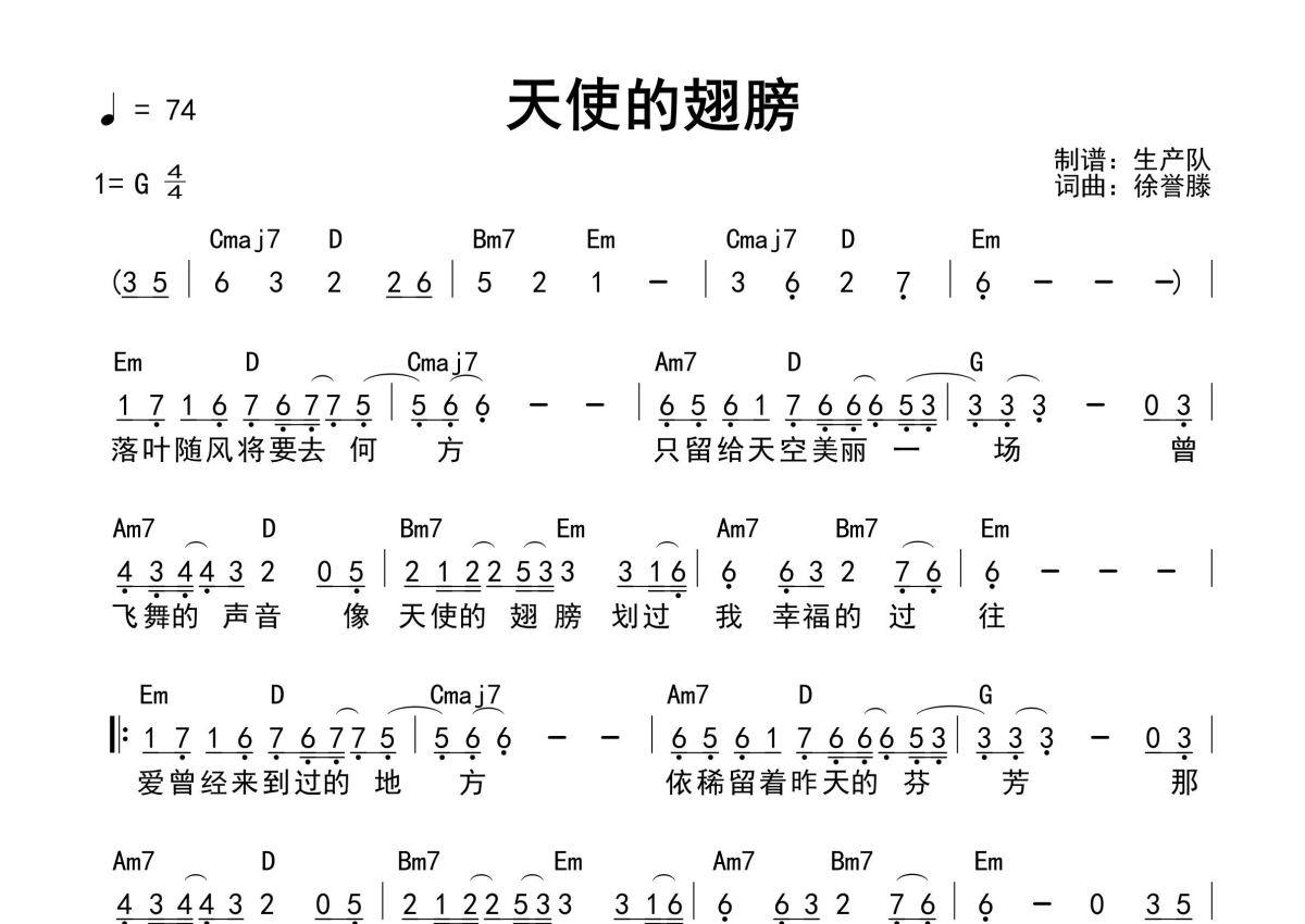 《天使的翅膀(和弦谱)》是和弦谱演唱的一首歌曲,和弦弹唱谱,拍号为4/4拍,歌曲速度为每分钟74拍,这份简谱共有一张高清图谱,图谱由 @生产队 编配上传徐誉滕演唱的经典歌曲《天使的翅膀》和弦弹唱谱,免翻页编配。