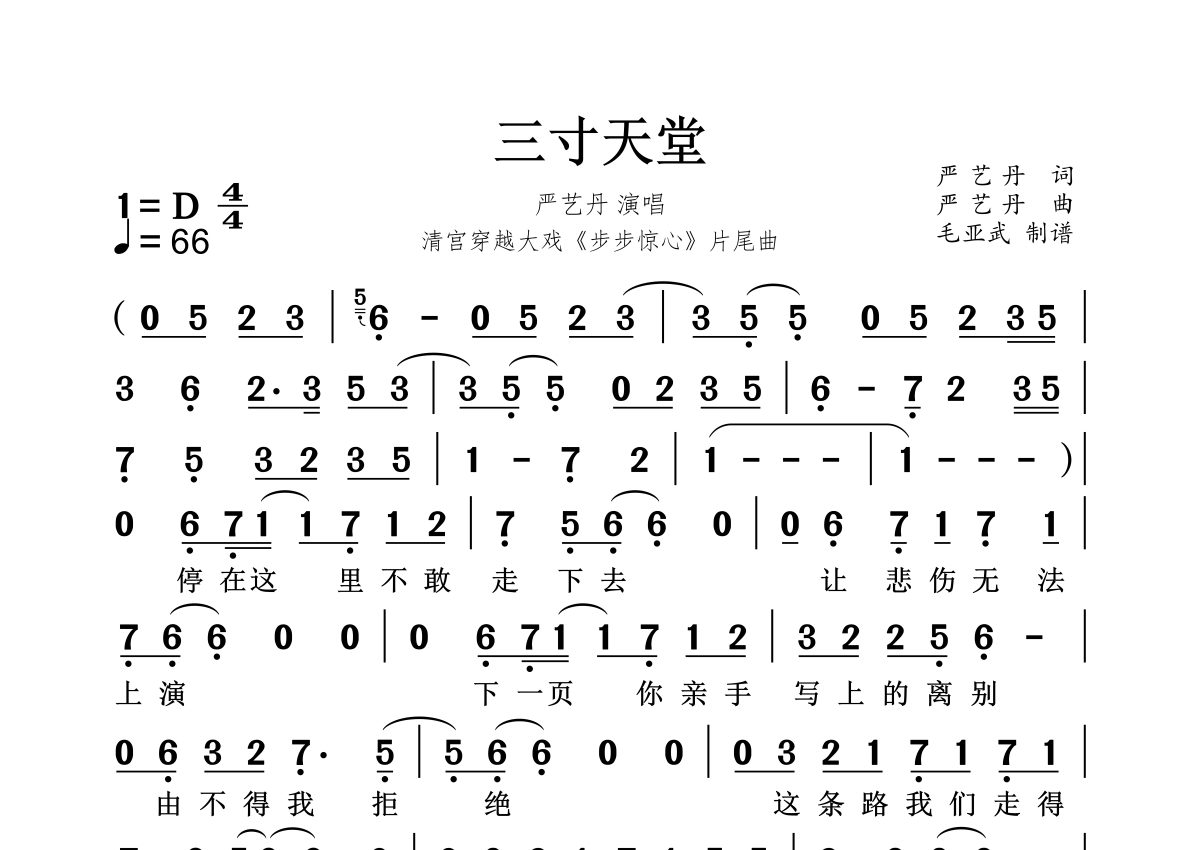 《三寸天堂》是严艺丹演唱的一首歌曲,这份简谱共有两张高清图谱,图谱由 @秋天的童话 编配上传。