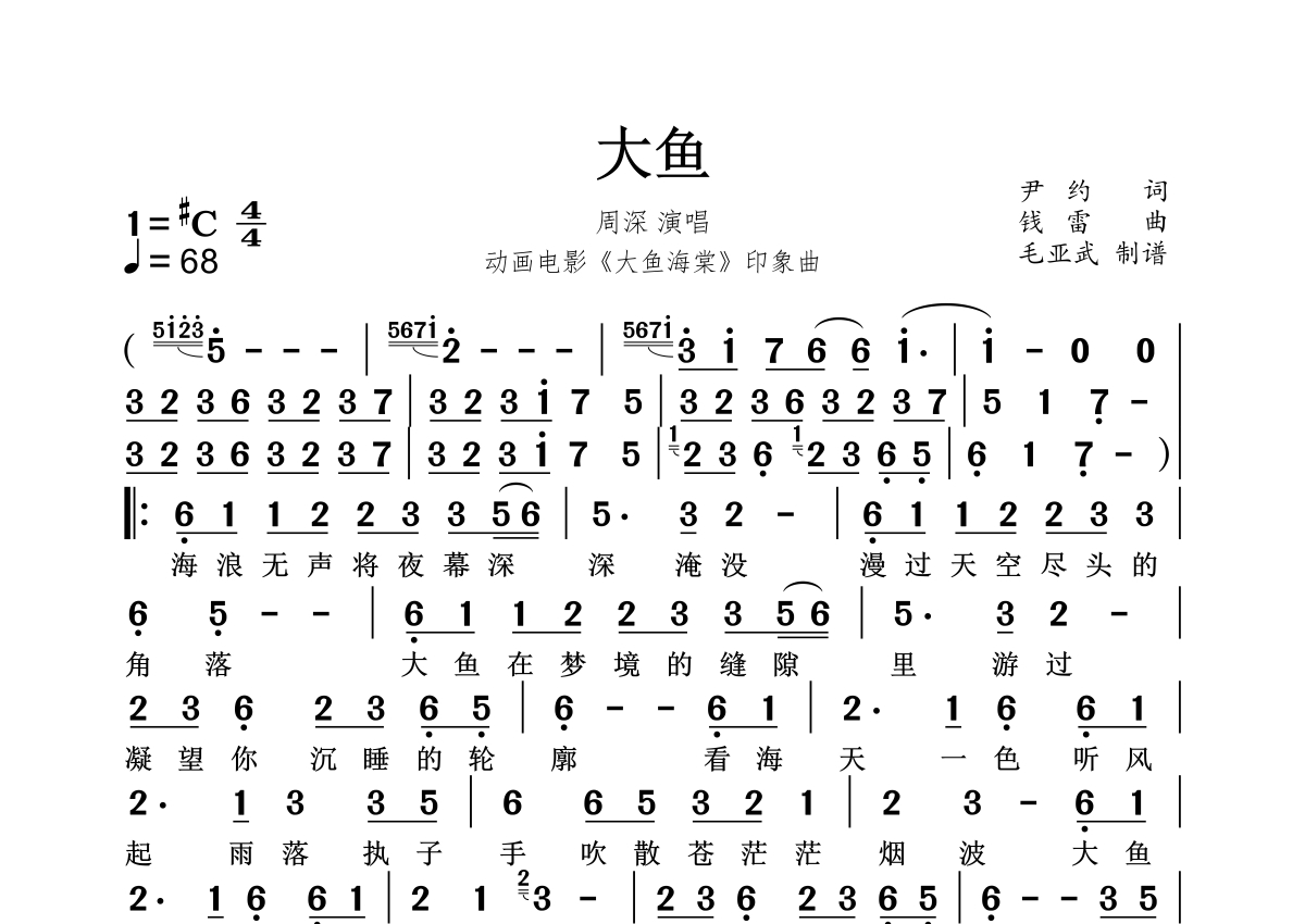 大鱼简谱 - 周深演唱