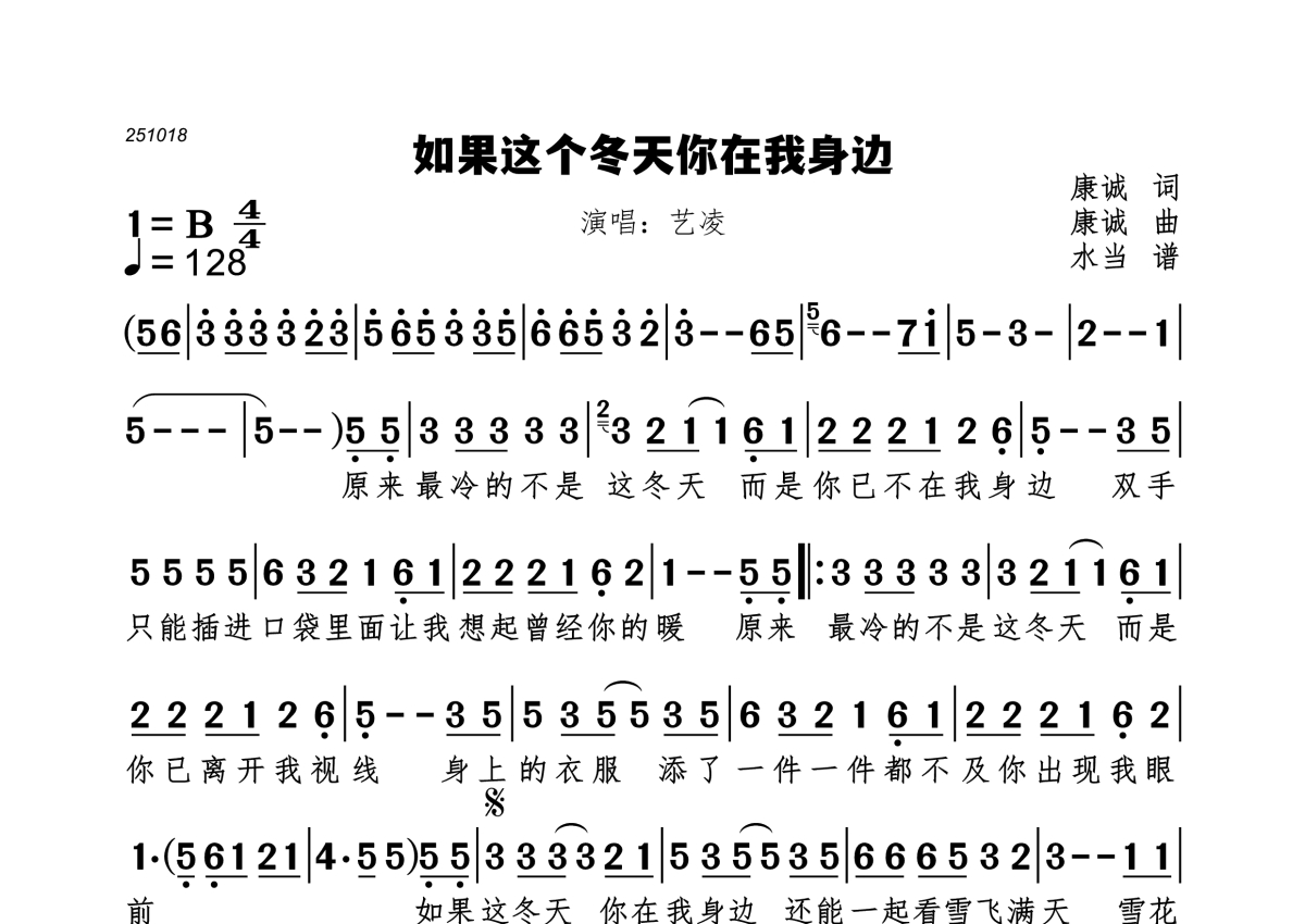 《如果这个冬天你在我身边》是艺凌演唱的一首歌曲,拍号为4/4拍,歌曲速度为每分钟128拍,这份简谱共有一张高清图谱,图谱由 @水当 编配上传。