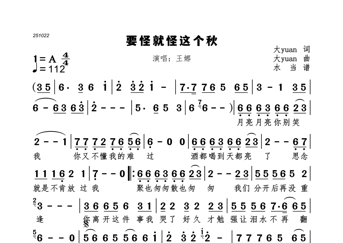 《要怪就怪这个秋》是王娜演唱的一首歌曲,拍号为4/4拍,歌曲速度为每分钟112拍,这份简谱共有一张高清图谱,图谱由 @水当 编配上传。