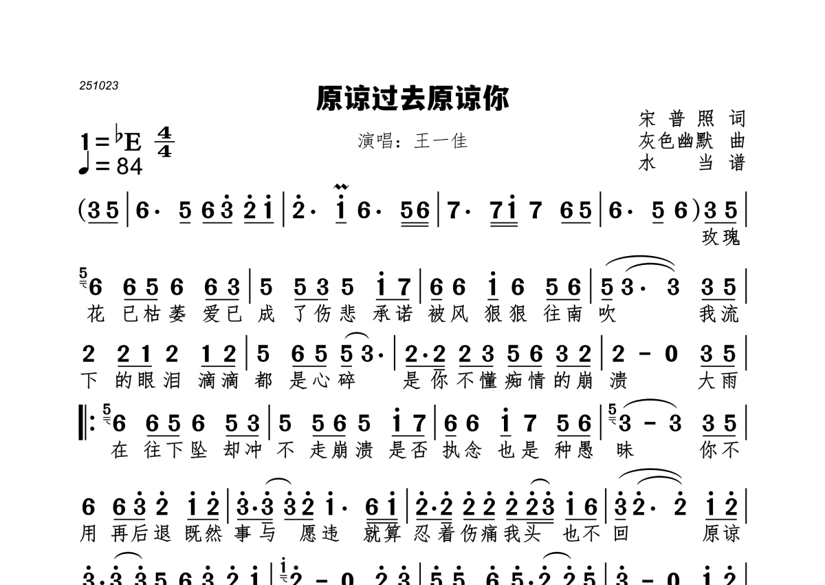 《原谅过去原谅你》是王一佳演唱的一首歌曲,拍号为4/4拍,歌曲速度为每分钟84拍,这份简谱共有一张高清图谱,图谱由 @水当 编配上传。