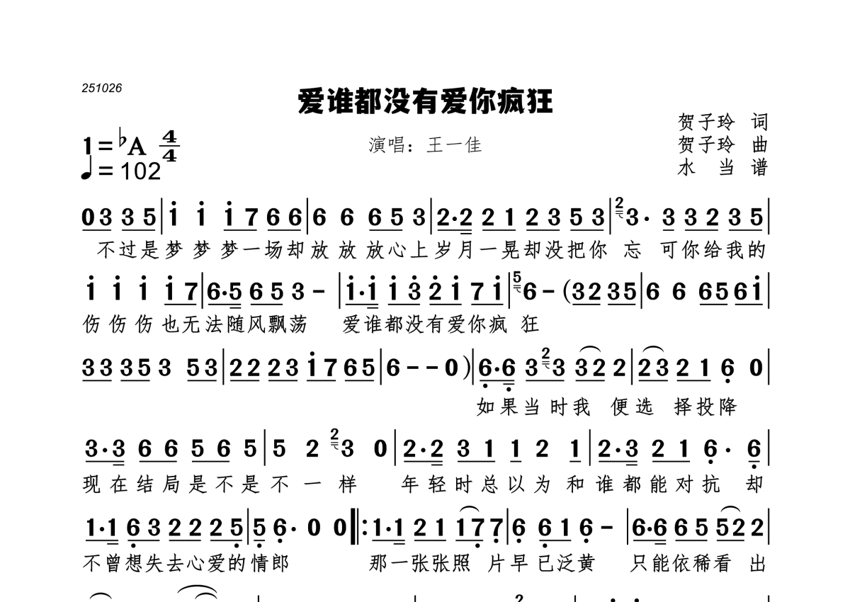 《爱谁都没有爱你疯狂》是王一佳演唱的一首歌曲,这份简谱共有一张高清图谱,图谱由 @水当 编配上传。