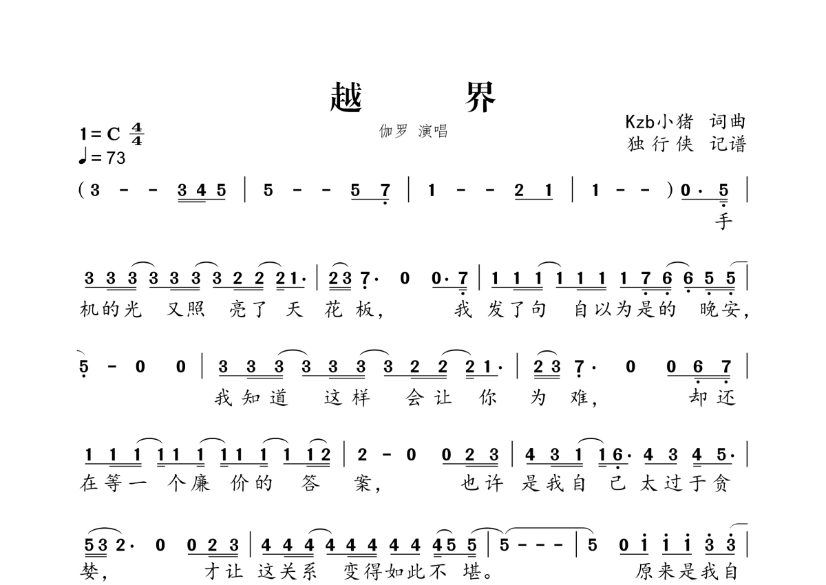 《越界》是伽罗演唱的一首歌曲,拍号为4/4拍,歌曲速度为每分钟73拍,这份简谱共有两张高清图谱,图谱由 @独行侠 编配上传。