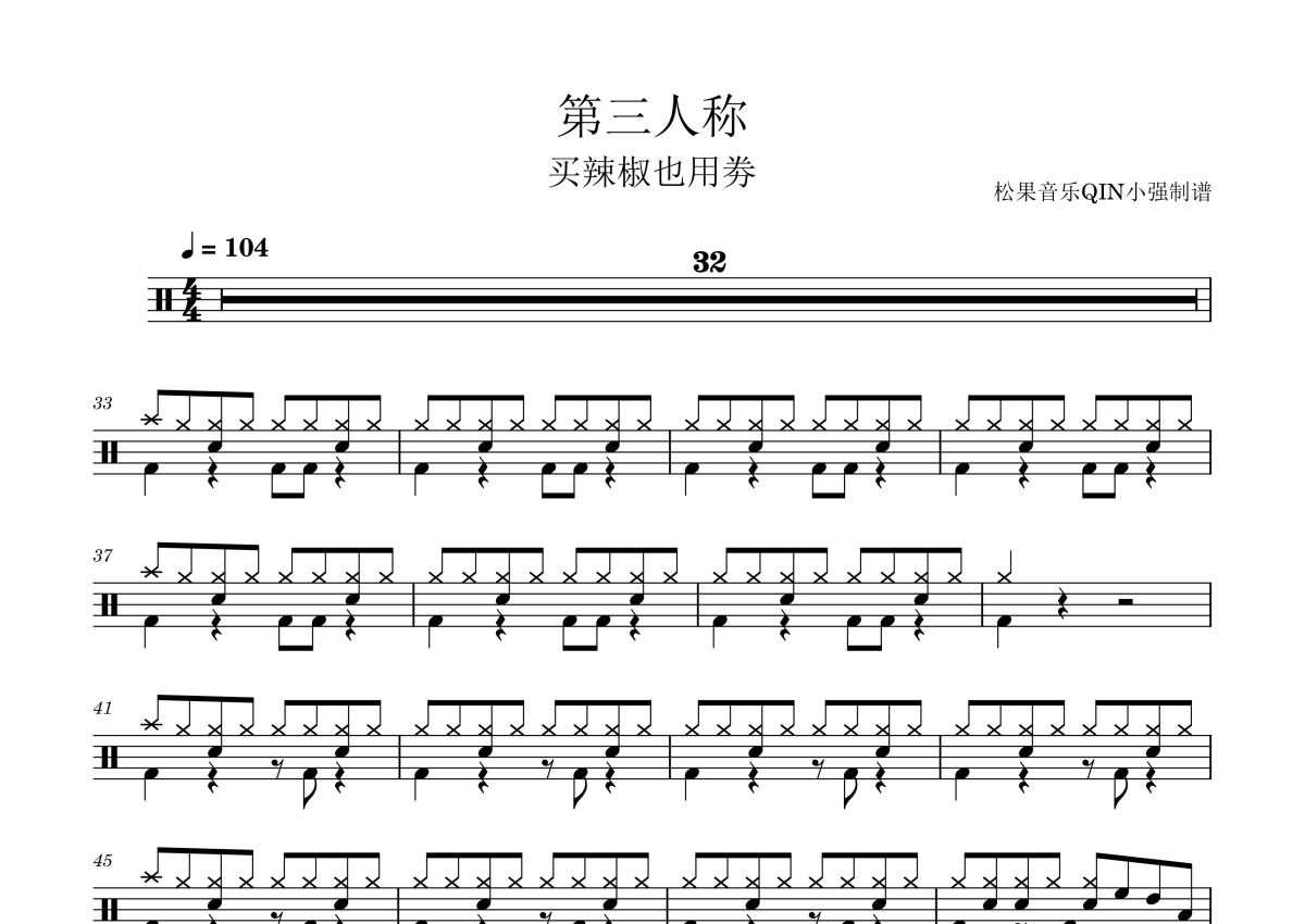 《第三人称》是买辣椒也用卷演唱的一首歌曲,拍号为4/4拍,这份架子鼓谱共有一张高清图谱,图谱由 @松果音乐QIN小强 编配上传,图谱使用五线谱编配,使用这份第三人称架子鼓谱,你将能够轻松地敲打出这首买辣椒也用卷的第三人称,快来尝试吧。第三人称是买辣椒也用卷演唱的一首歌曲。