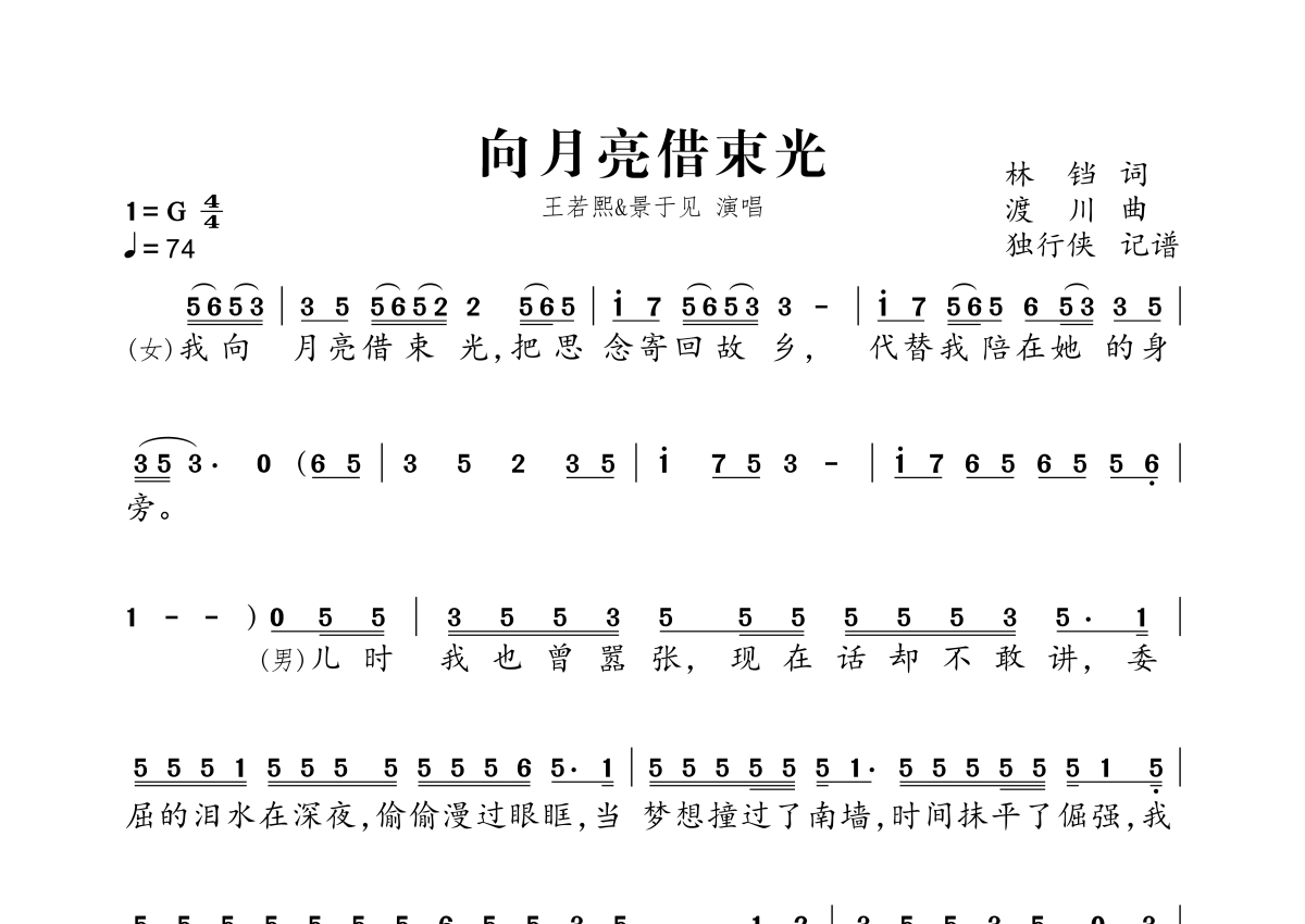 《向月亮借束光》是王若熙、景于见演唱的一首歌曲,拍号为4/4拍,歌曲速度为每分钟74拍,这份简谱共有两张高清图谱,图谱由 @独行侠 编配上传。