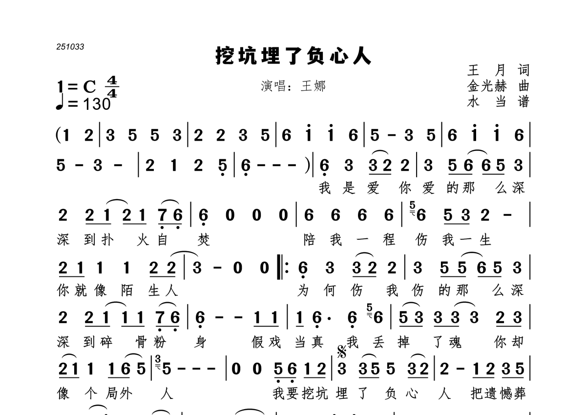 挖坑埋了负心人简谱 - 王娜演唱