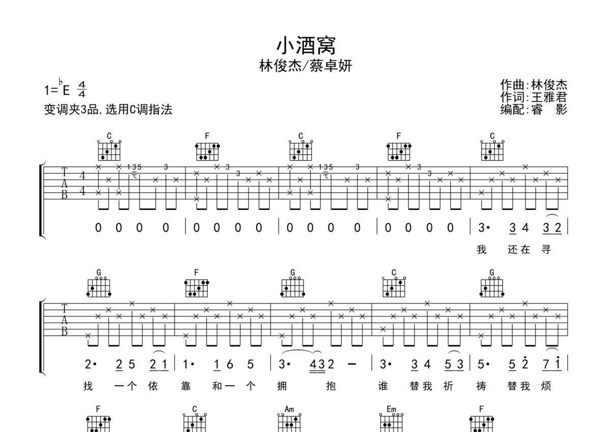 林俊杰/蔡卓妍《小酒窝》吉他谱 - C调弹唱六线谱