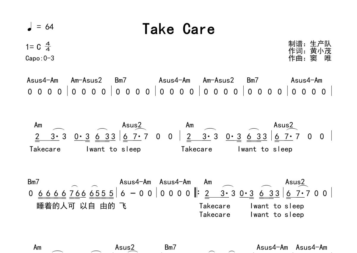《Take Care(和弦谱)》是和弦谱演唱的一首歌曲,和弦谱,拍号为4/4拍,歌曲速度为每分钟64拍,这份简谱共有一张高清图谱,图谱由 @生产队 编配上传黑豹乐队演唱的经典歌曲《Take Care》和弦弹唱谱,C调免翻页编配,吉他必弹曲目。