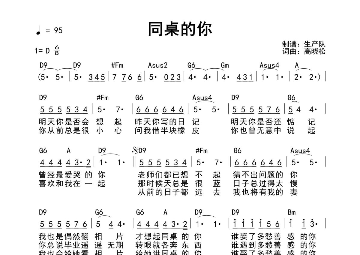 《同桌的你(和弦谱)》是和弦谱演唱的一首歌曲,和弦谱,拍号为6/8拍,歌曲速度为每分钟95拍,这份简谱共有一张高清图谱,图谱由 @生产队 编配上传老狼演唱的经典歌曲《同桌的你》和弦弹唱谱,免翻页编配,吉他必弹曲目。