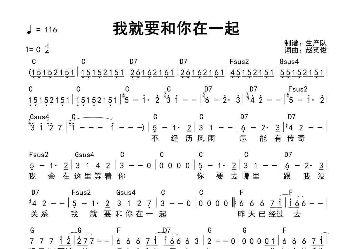 《我就要和你在一起(和弦谱)》是和弦谱演唱的一首歌曲,和弦谱,拍号为4/4拍,歌曲速度为每分钟116拍,这份简谱共有一张高清图谱,图谱由 @生产队 编配上传赵英俊&夏筠妍演唱的经典歌曲《我就要和你在一起》和弦弹唱谱,免翻页编配,吉他必弹曲目。