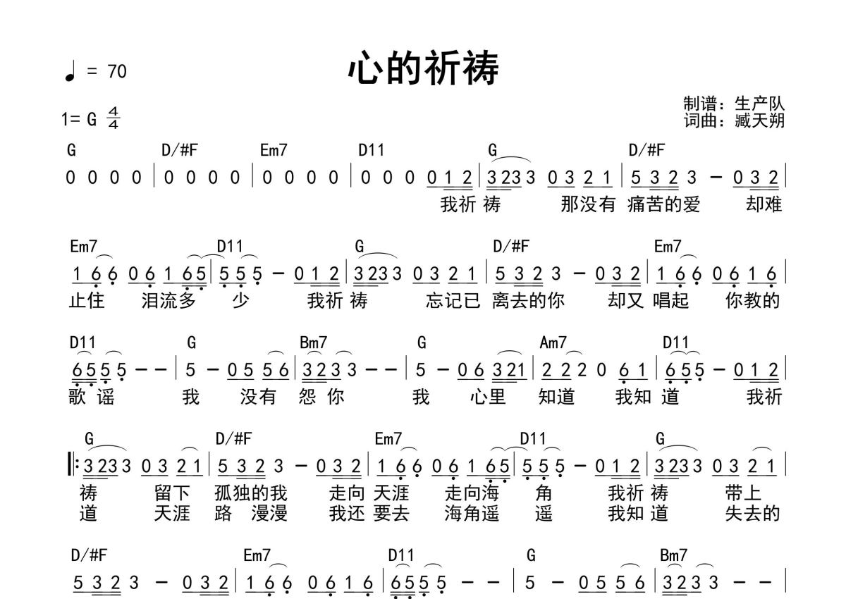 《心的祈祷(和弦谱)》是和弦谱演唱的一首歌曲,和弦谱,拍号为4/4拍,歌曲速度为每分钟70拍,这份简谱共有一张高清图谱,图谱由 @生产队 编配上传臧天朔演唱的经典歌曲《心的祈祷》和弦弹唱谱,免翻页编配,弹唱必弹曲目。