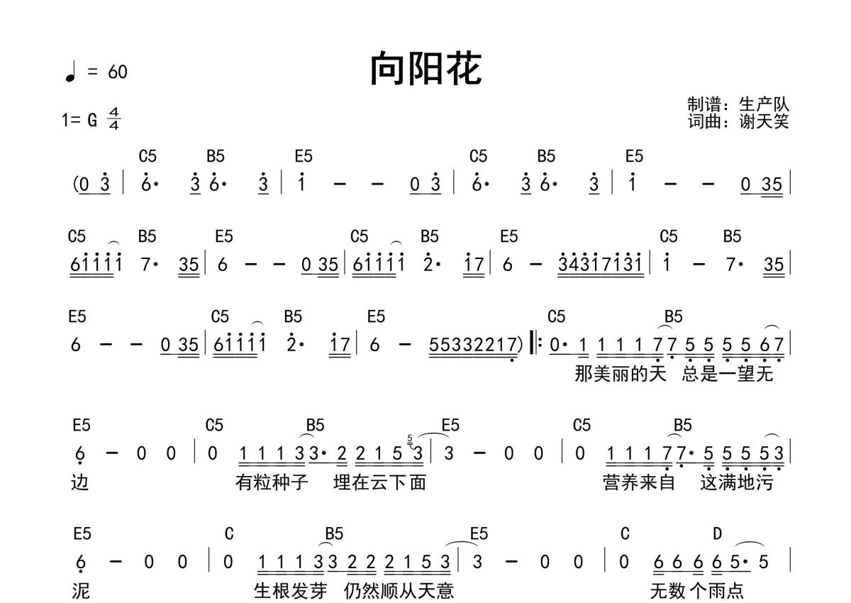 《向阳花(和弦谱)》是和弦谱演唱的一首歌曲,和弦谱,拍号为4/4拍,歌曲速度为每分钟60拍,这份简谱共有一张高清图谱,图谱由 @生产队 编配上传谢天笑演唱的经典歌曲《向阳花》和弦弹唱谱,免翻页编配,弹唱必弹曲目。