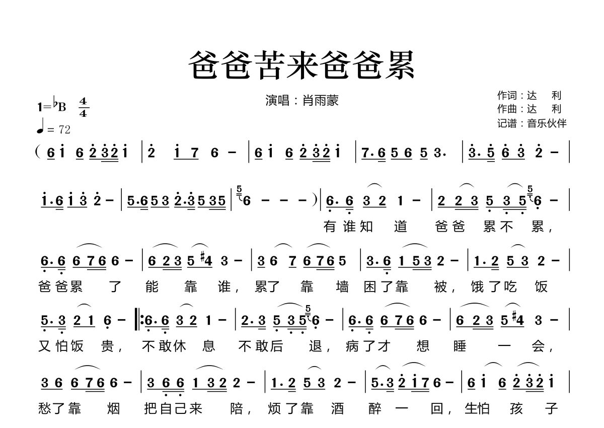 《爸爸苦来爸爸累》是肖雨蒙演唱的一首歌曲,拍号为4/4拍,歌曲速度为每分钟72拍,这份简谱共有一张高清图谱,图谱由 @音乐伙伴 编配上传。