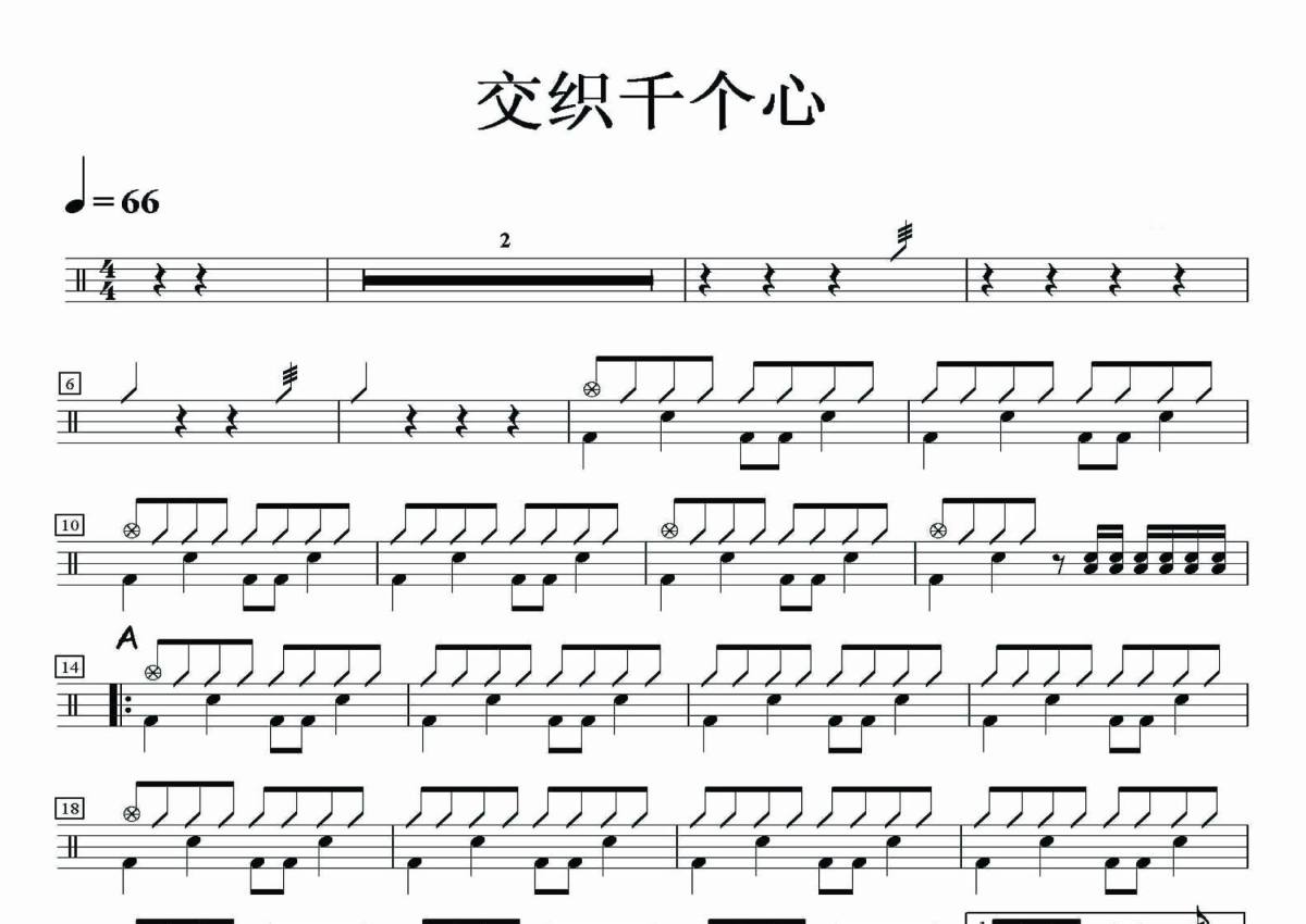 《交织千个心》是Beyond演唱的一首歌曲,拍号为4/4拍,歌曲速度为每分钟65拍,这份架子鼓谱共有两张高清图谱,图谱由 @音符喷血者 编配上传,图谱使用五线谱编配,使用这份交织千个心架子鼓谱,你将能够轻松地敲打出这首Beyond的交织千个心,快来尝试吧。