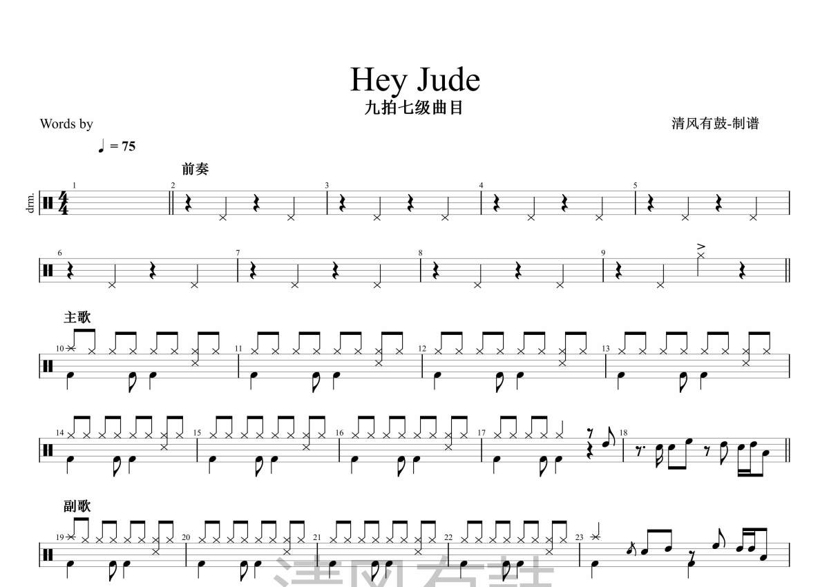 《Hey Jude》是九拍七级演唱的一首歌曲,拍号为4/4拍,这份架子鼓谱共有两张高清图谱,图谱由 @清风有鼓 编配上传,图谱使用五线谱编配,使用这份Hey Jude架子鼓谱,你将能够轻松地敲打出这首九拍七级的Hey Jude,快来尝试吧。