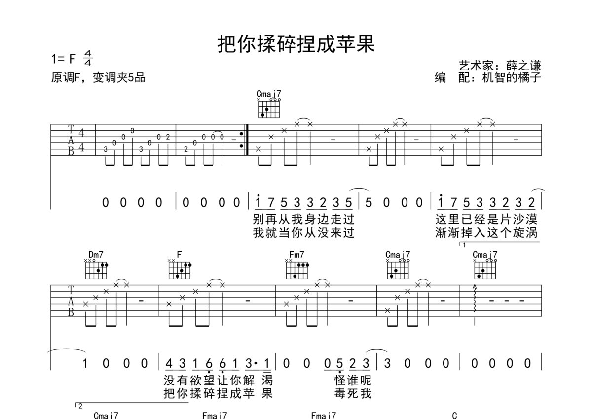 《把你揉碎捏成苹果》是薛之谦演唱的一首歌曲,本吉他谱采用的是C调指法编配,这份吉他谱共有两张高清图谱,图谱由 @机智的橘子 编配上传,图谱使用六线谱编配,包含吉他和弦指法、简谱以及歌词部分,曲谱配备了相关的音频提供试听,使用这份把你揉碎捏成苹果吉他谱,可以让你更加方便地掌握这首歌曲的弹唱技巧,快来尝试吧。原调变调夹5品,这里用的是变调夹2品,有问题微信:ju11134988。