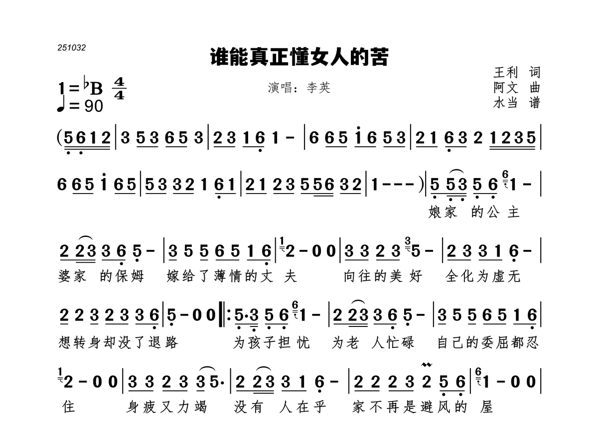 《谁能真正懂女人的苦》是李英演唱的一首歌曲,拍号为4/4拍,歌曲速度为每分钟90拍,这份简谱共有一张高清图谱,图谱由 @水当 编配上传。