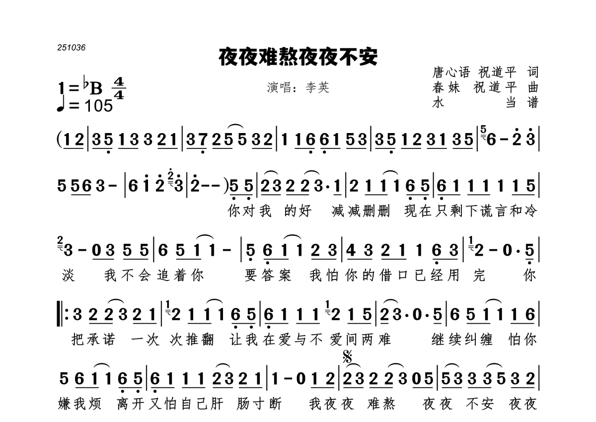 《夜夜难熬夜夜不安》是李英演唱的一首歌曲,拍号为4/4拍,歌曲速度为每分钟105拍,这份简谱共有一张高清图谱,图谱由 @水当 编配上传。