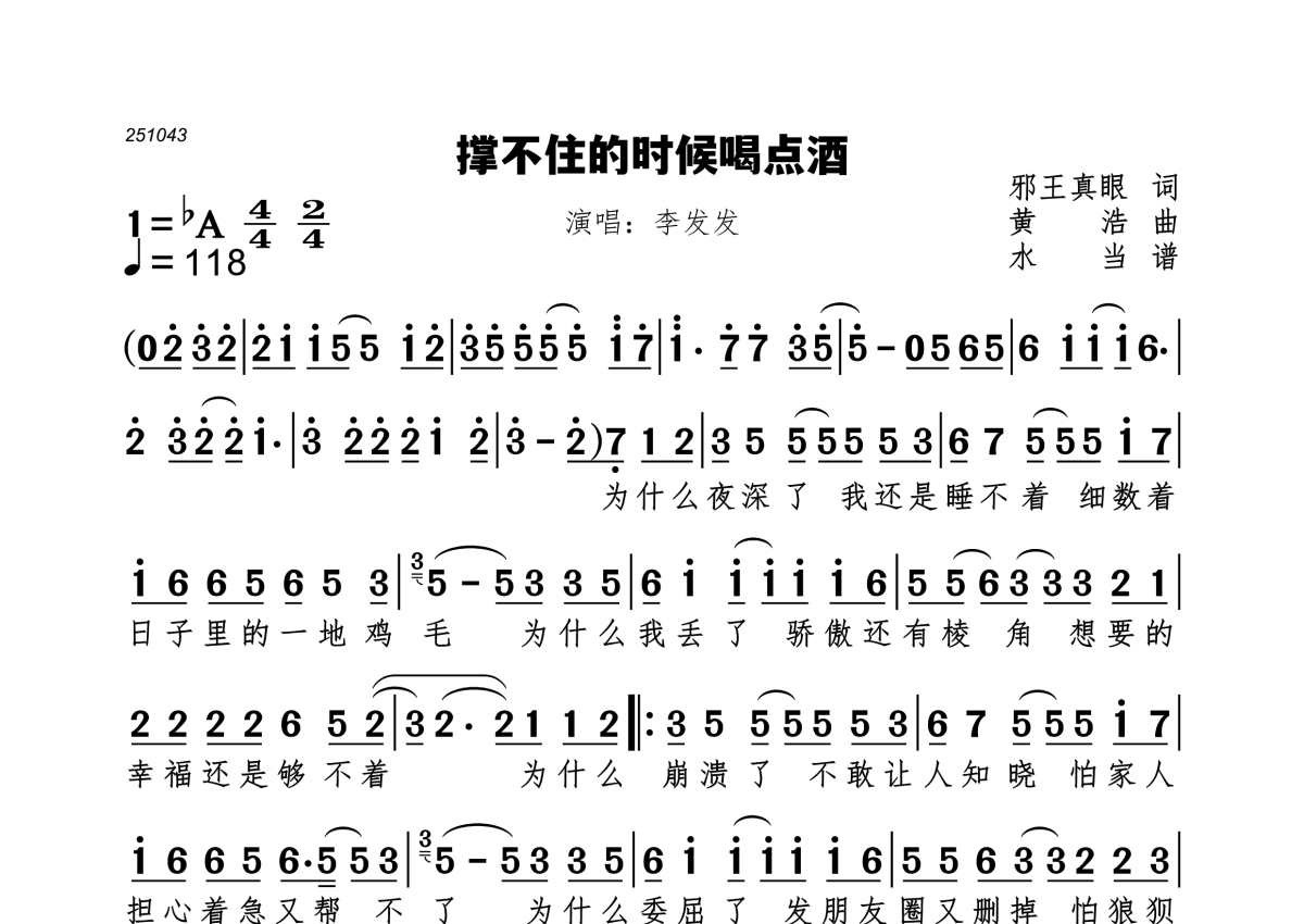 《撑不住的时候喝点酒》是李发发演唱的一首歌曲,拍号为4/4拍,歌曲速度为每分钟118拍,这份简谱共有一张高清图谱,图谱由 @水当 编配上传。