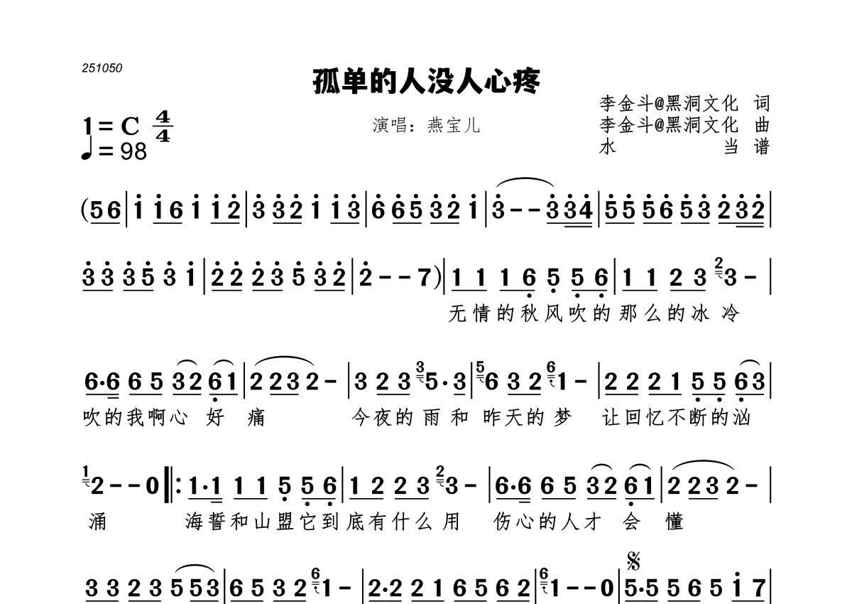 《孤单的人没人心疼》是燕宝儿演唱的一首歌曲,歌曲速度为每分钟98拍,这份简谱共有一张高清图谱,图谱由 @水当 编配上传。