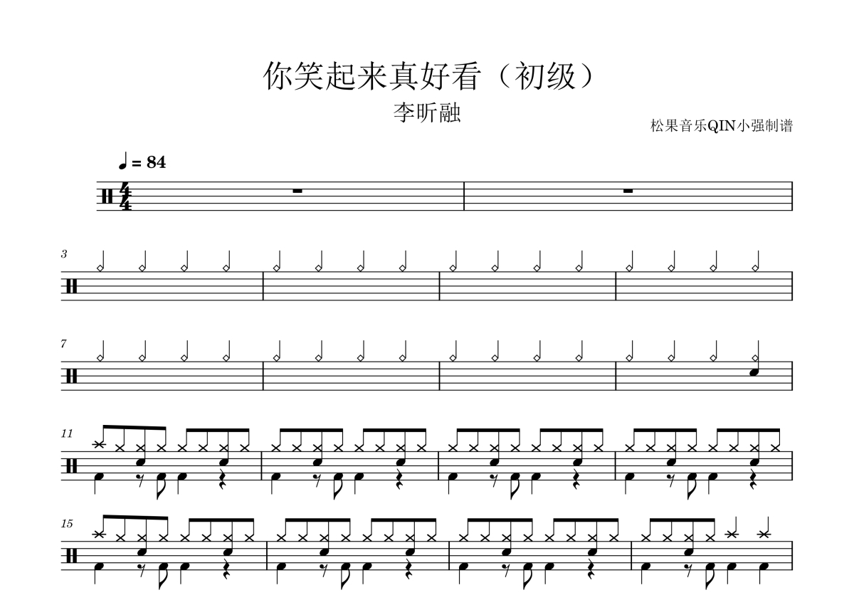 《你笑起来真好看(初级)》是初级演唱的一首歌曲,拍号为4/4拍,这份架子鼓谱共有两张高清图谱,图谱由 @松果音乐QIN小强 编配上传,图谱使用五线谱编配,使用这份你笑起来真好看(初级)架子鼓谱,你将能够轻松地敲打出这首初级的你笑起来真好看(初级),快来尝试吧。《你笑起来真好看》是李昕融、樊桐舟、李凯稠演唱的歌曲,由周兵作词,李凯稠作曲,于2019年6月25日以单曲形式在数字音乐平台发行。