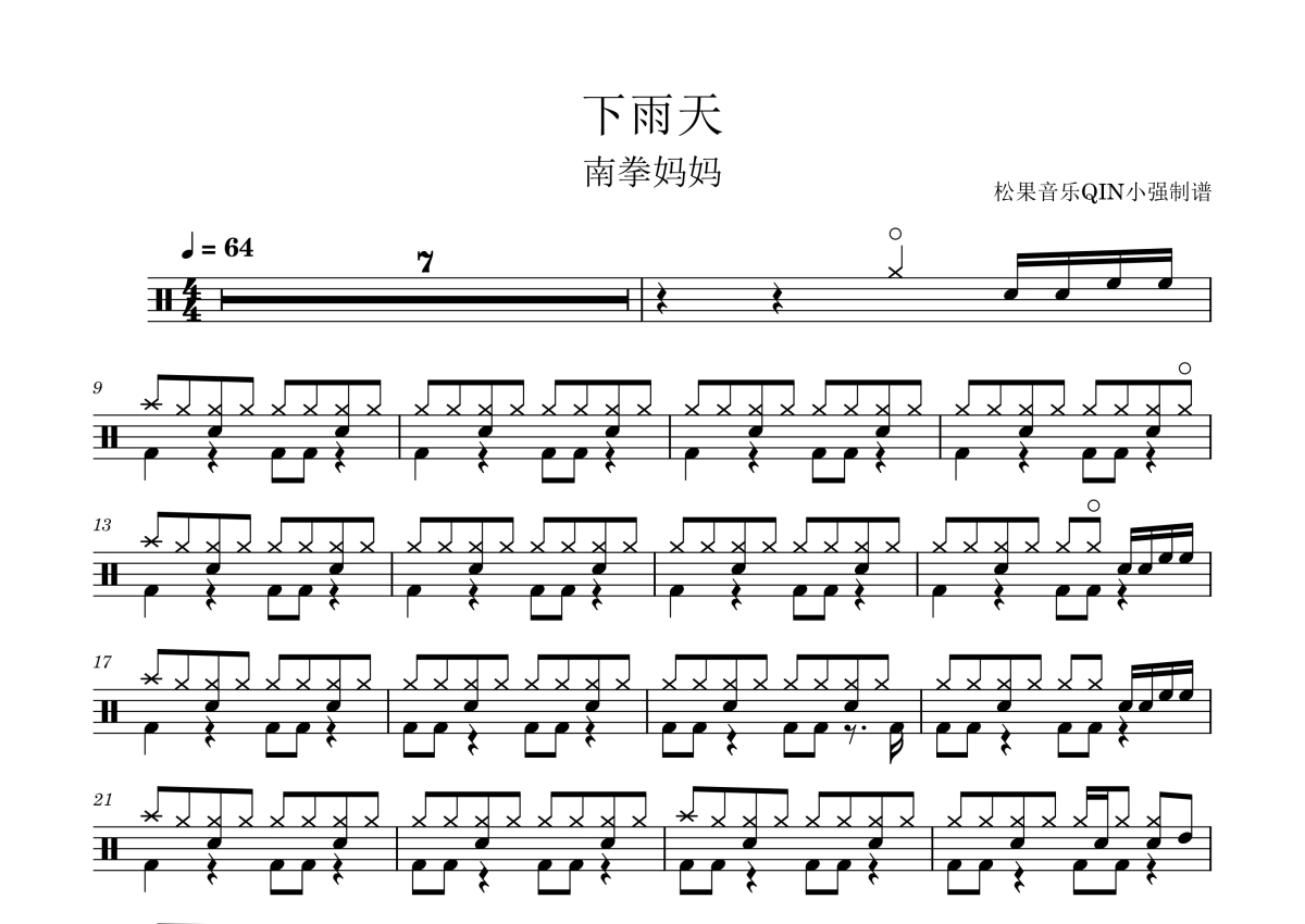 《下雨天》是南拳妈妈演唱的一首歌曲,拍号为4/4拍,这份架子鼓谱共有两张高清图谱,图谱由 @松果音乐QIN小强 编配上传,图谱使用五线谱编配,使用这份下雨天架子鼓谱,你将能够轻松地敲打出这首南拳妈妈的下雨天,快来尝试吧。《下雨天》是南拳妈妈演唱的流行歌曲,由梁心颐填词,张杰谱曲,洪敬尧编曲,收录在南拳妈妈于2008年7月25日发行的专辑《优の良曲南搞小孩》中。