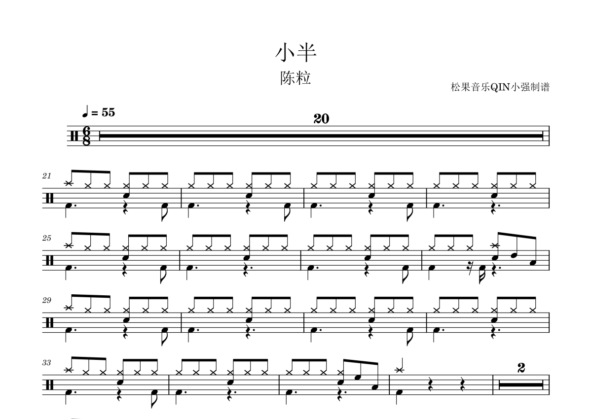 《小半》是陈粒演唱的一首歌曲,拍号为4/4拍,这份架子鼓谱共有三张高清图谱,图谱由 @松果音乐QIN小强 编配上传,图谱使用五线谱编配,使用这份小半架子鼓谱,你将能够轻松地敲打出这首陈粒的小半,快来尝试吧。《小半》是由涂玲子作词、陈粒作曲并演唱的歌曲,收录在陈粒2016年7月26日发行的专辑《小梦大半》中。