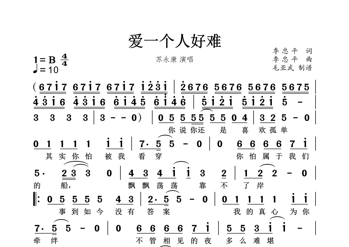 《爱一个人好难》是苏永康演唱的一首歌曲,这份简谱共有两张高清图谱,图谱由 @秋天的童话 编配上传。