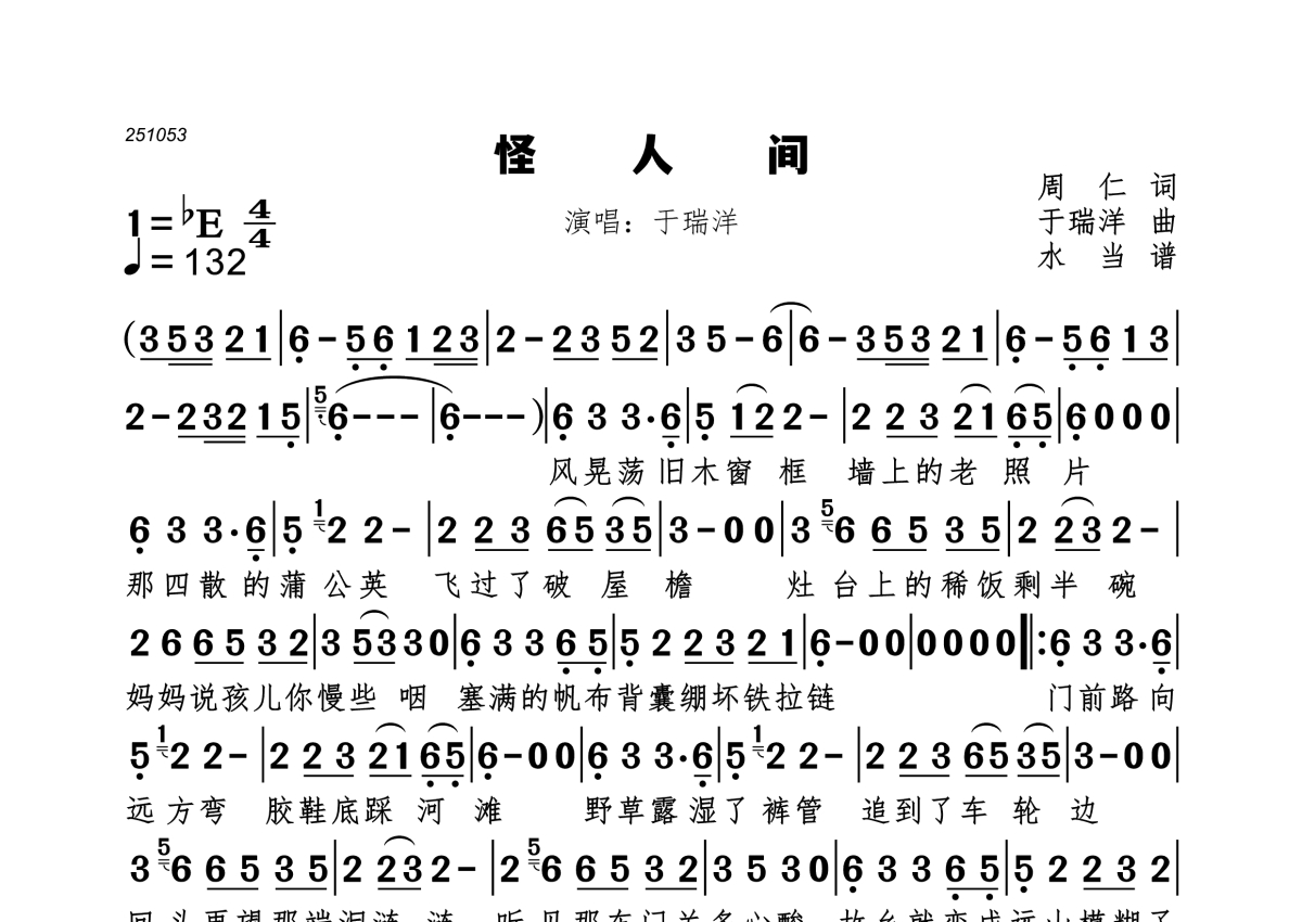 《怪人间》是于瑞洋演唱的一首歌曲,拍号为4/4拍,歌曲速度为每分钟132拍,这份简谱共有一张高清图谱,图谱由 @水当 编配上传。