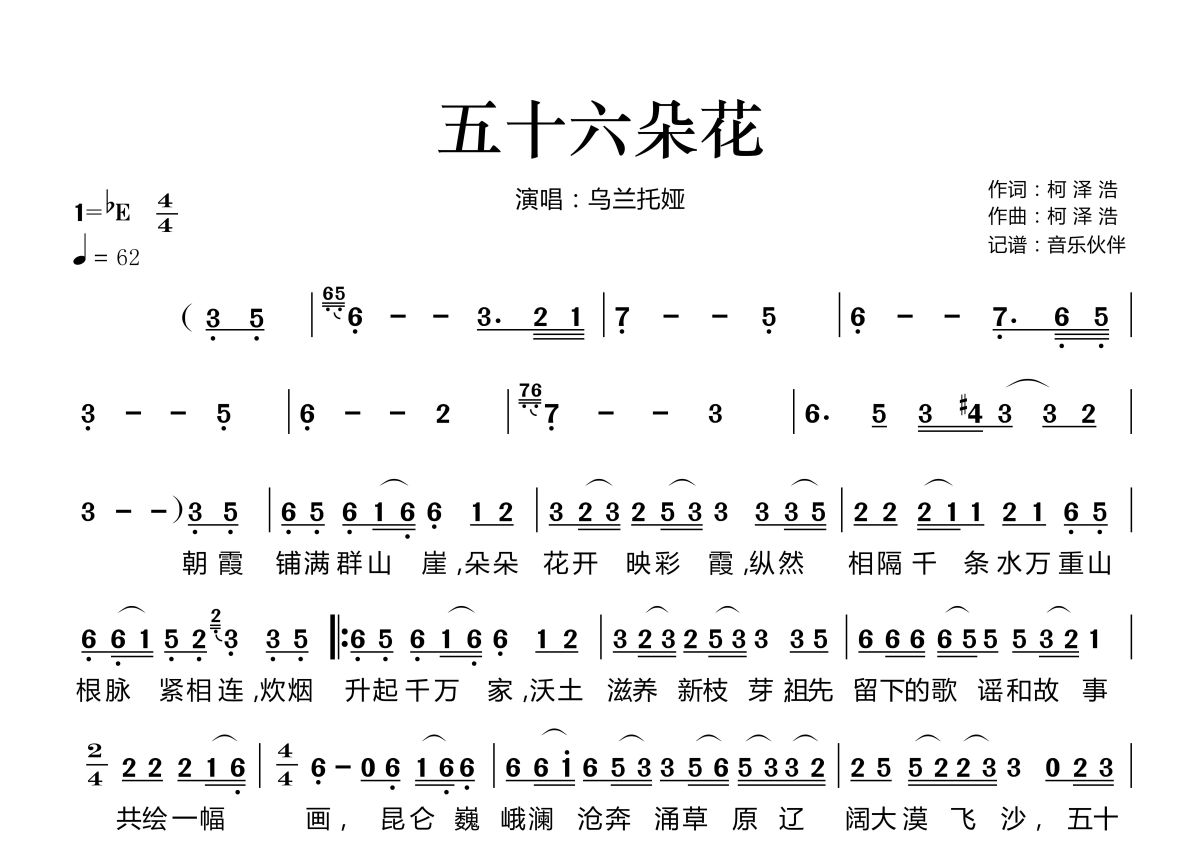 《五十六朵花》是乌兰托娅演唱的一首歌曲,拍号为4/4拍,歌曲速度为每分钟62拍,这份简谱共有一张高清图谱,图谱由 @音乐伙伴 编配上传。
