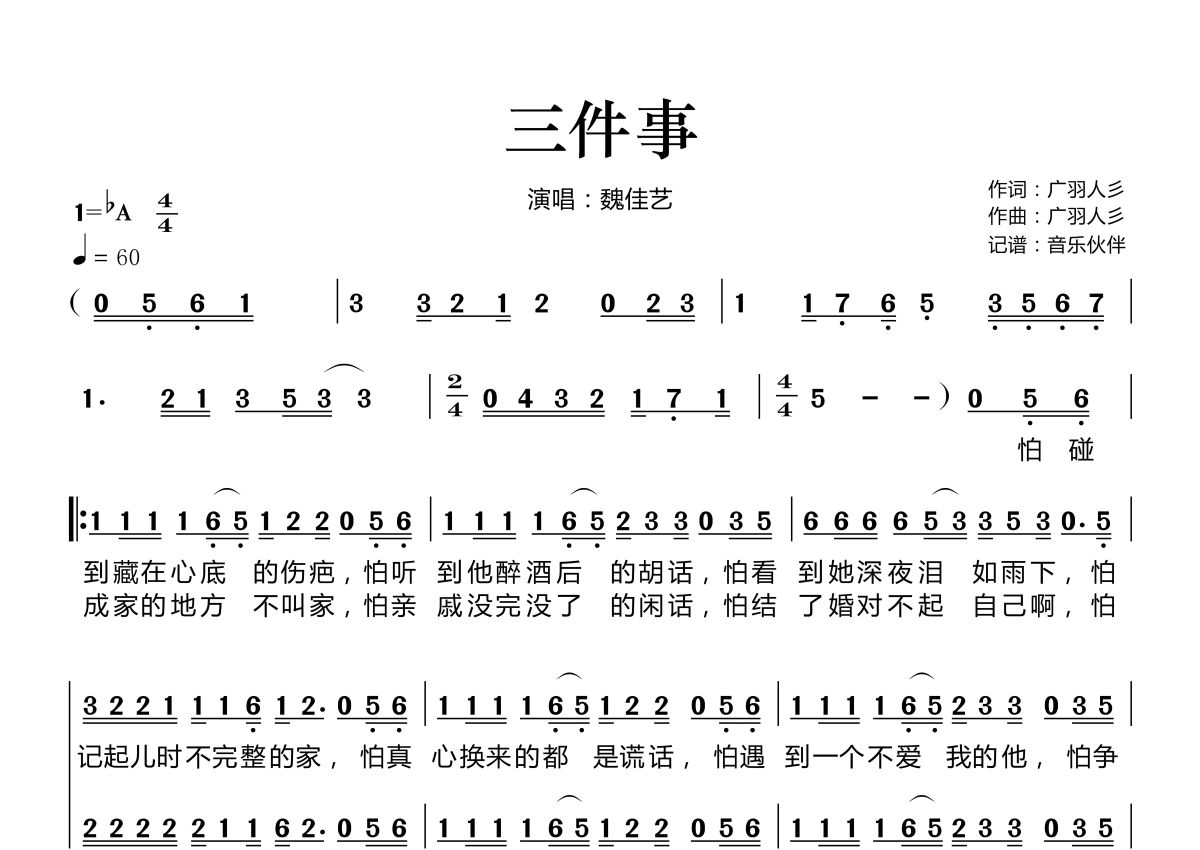 《三件事》是魏佳艺演唱的一首歌曲,拍号为4/4拍,歌曲速度为每分钟60拍,这份简谱共有两张高清图谱,图谱由 @音乐伙伴 编配上传。