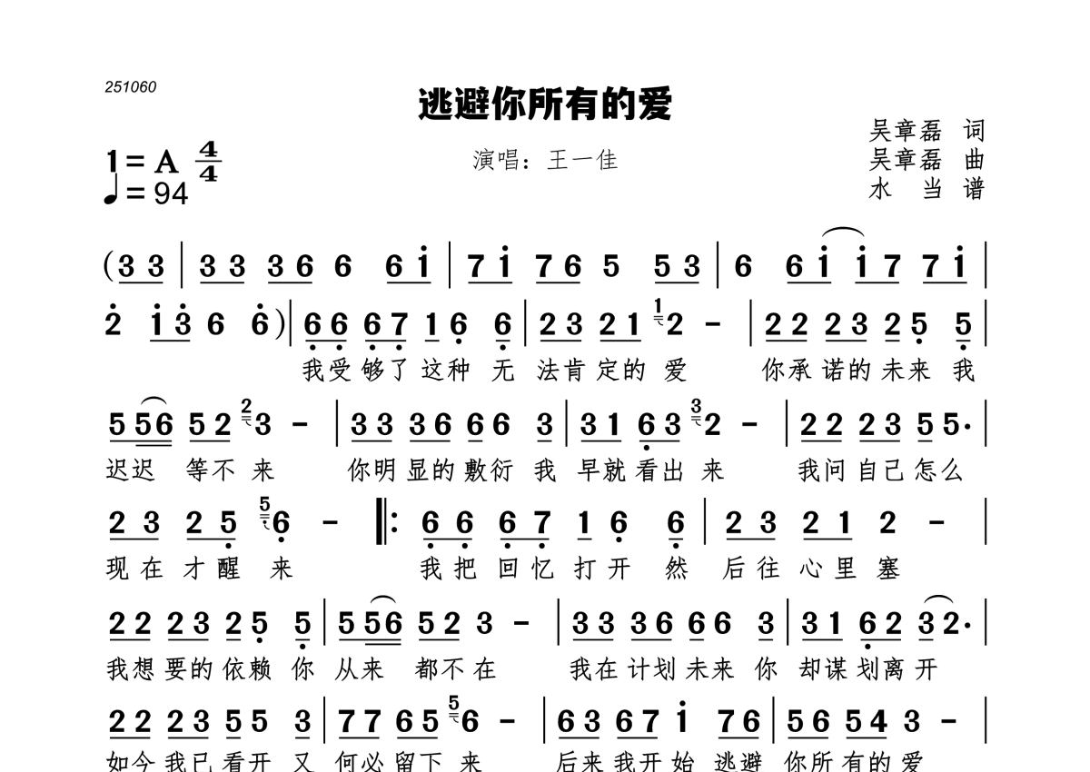 《逃避你所有的爱》是王一佳演唱的一首歌曲,拍号为4/4拍,歌曲速度为每分钟94拍,这份简谱共有一张高清图谱,图谱由 @水当 编配上传。