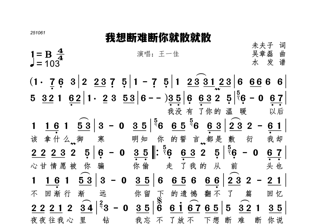 我想断难断你就散就散简谱 - 王一佳演唱
