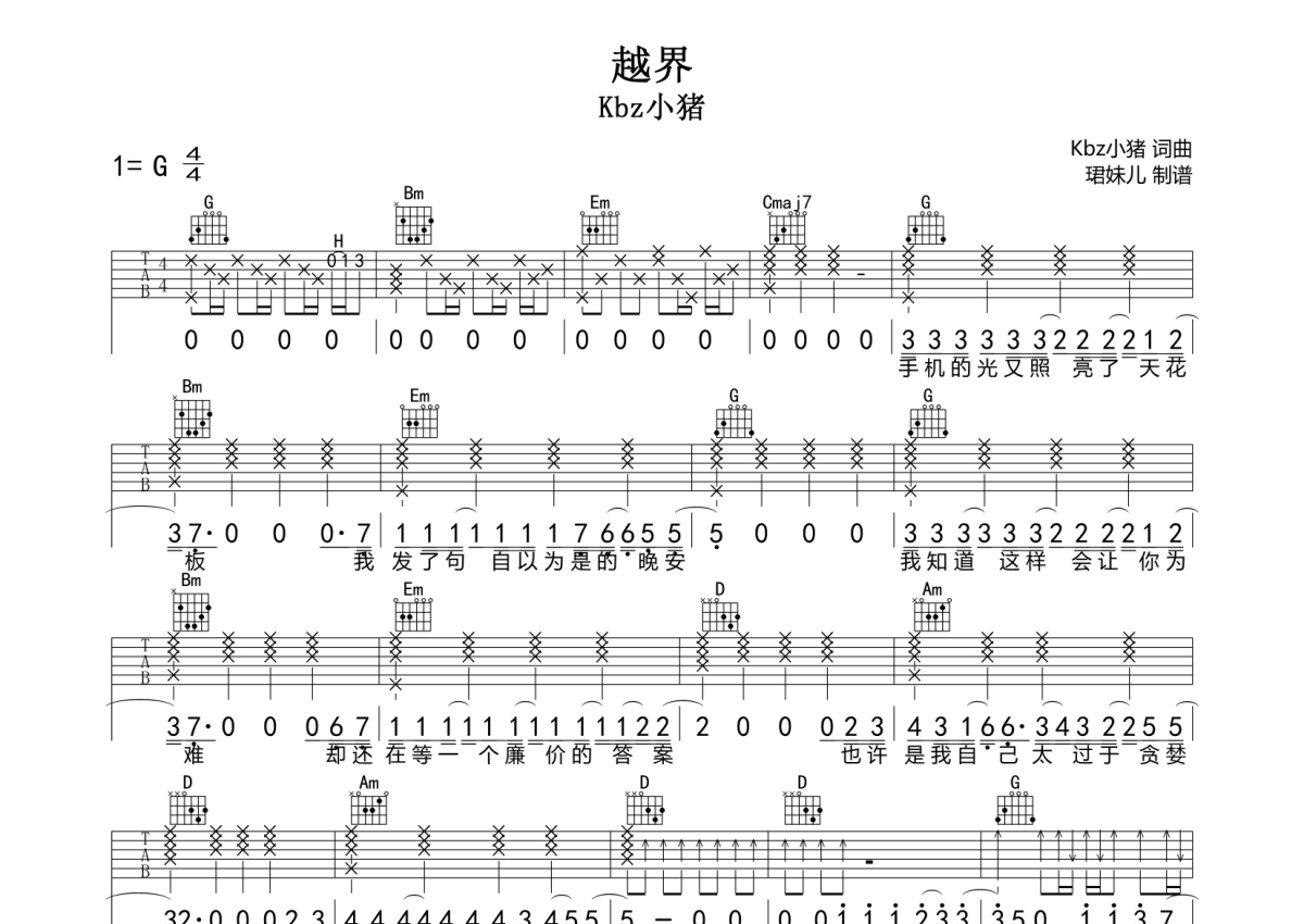 《越界》吉他谱 - Kbz小猪 - G调弹唱六线谱