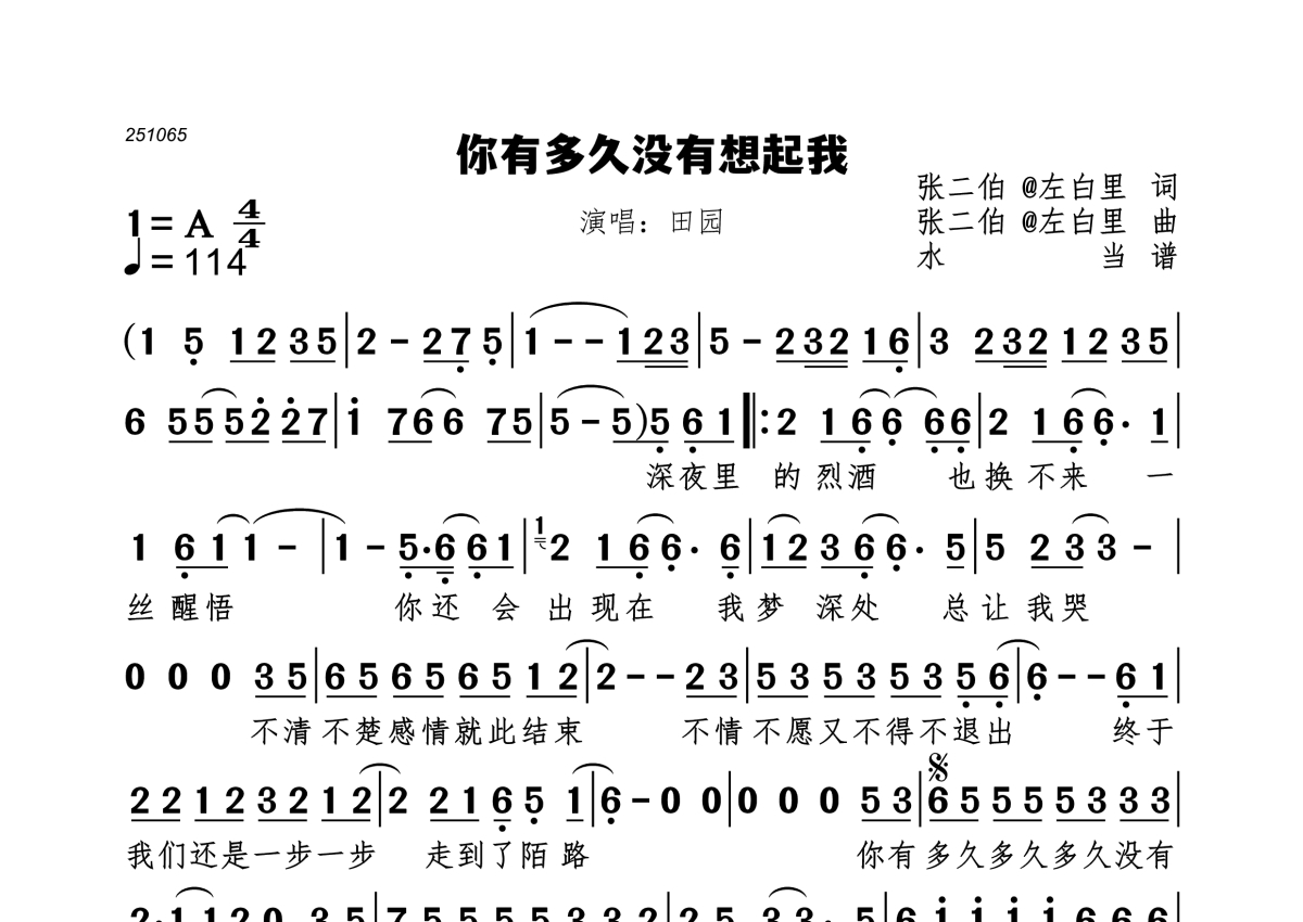 《你有多久没有想起我》是田园演唱的一首歌曲,拍号为4/4拍,歌曲速度为每分钟114拍,这份简谱共有一张高清图谱,图谱由 @水当 编配上传。