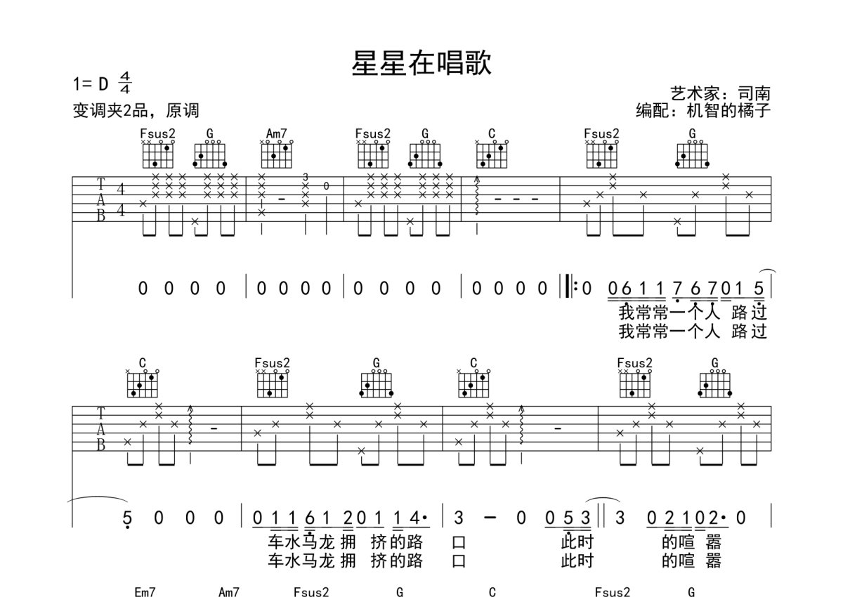 司南《星星在唱歌》吉他谱 - C调弹唱六线谱