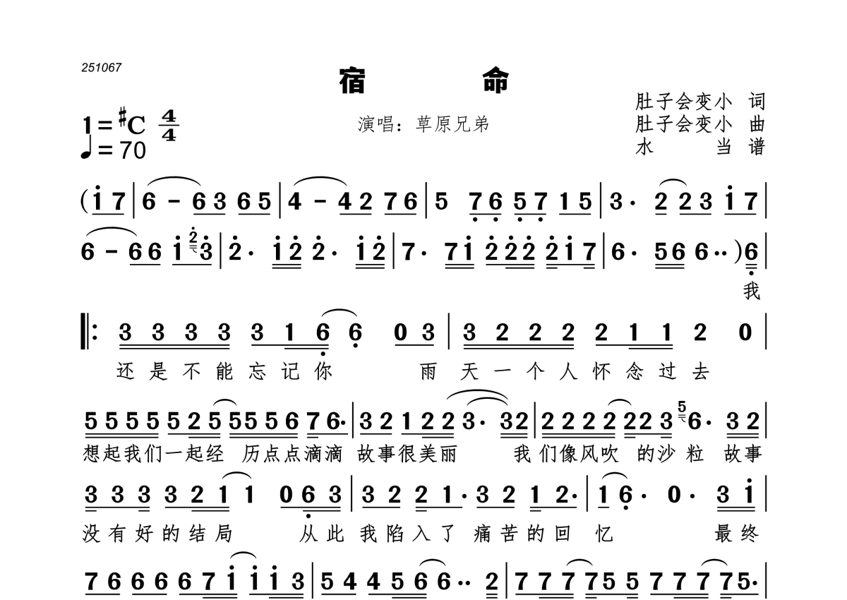 《宿命》是草原兄弟演唱的一首歌曲,拍号为4/4拍,歌曲速度为每分钟70拍,这份简谱共有一张高清图谱,图谱由 @水当 编配上传。