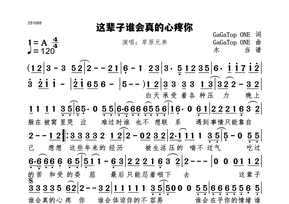 《这辈子谁会真的心疼你》是草原兄弟演唱的一首歌曲,拍号为4/4拍,歌曲速度为每分钟120拍,这份简谱共有一张高清图谱,图谱由 @水当 编配上传。