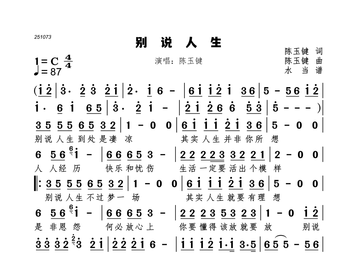 《别说人生》是陈玉键演唱的一首歌曲,拍号为4/4拍,歌曲速度为每分钟87拍,这份简谱共有一张高清图谱,图谱由 @水当 编配上传。