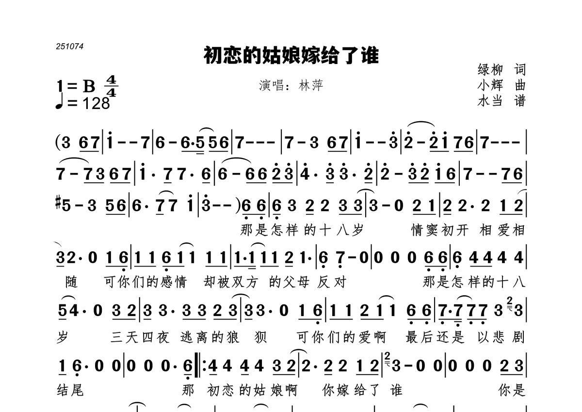《初恋的姑娘嫁给了谁》是林萍演唱的一首歌曲,拍号为4/4拍,歌曲速度为每分钟128拍,这份简谱共有一张高清图谱,图谱由 @水当 编配上传。