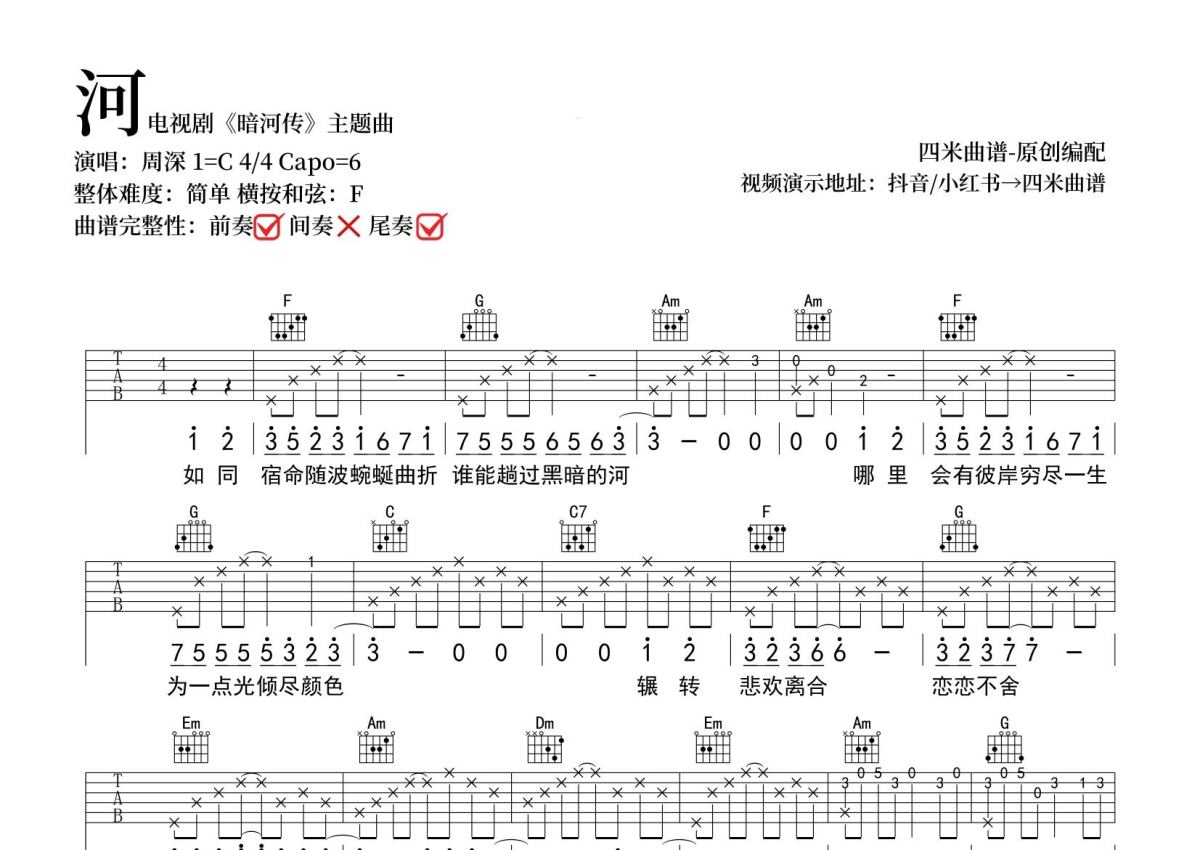 《河》是周深演唱的一首歌曲,拍号为4/4拍,歌曲原调为C调,本吉他谱采用的是C调指法编配,变调夹6品弹奏即为原调,当然也可以根据自己的音域改变变调夹位置,或者通过改变和弦调性,以方便自己弹奏,这份吉他谱共有两张高清图谱,图谱由 @SRV7758521 编配上传,图谱使用六线谱编配,包含吉他和弦指法、简谱以及歌词部分,使用这份河吉他谱,可以让你更加方便地掌握这首歌曲的弹唱技巧,快来尝试吧。